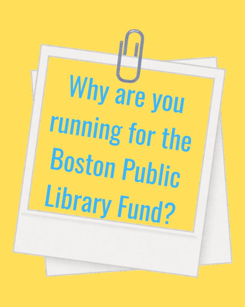 Obviously if you are going to run for a charity it needs to be important to you and connected to your why. So, why the Boston Public Library Fund? Here’s what I said on my application for the team: